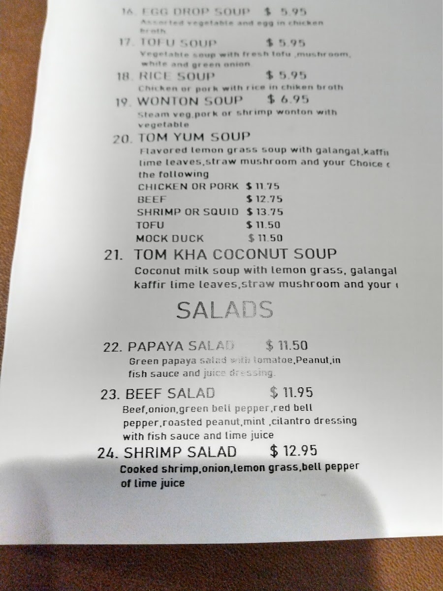 Not to be missed is the delightful Sweet Sticky Rice with Mango, a perfect finish to your meal. The beverage section complements your dining experience with traditional options like Thai Iced Tea and Hot Thai Coffee, marrying taste with authenticity.